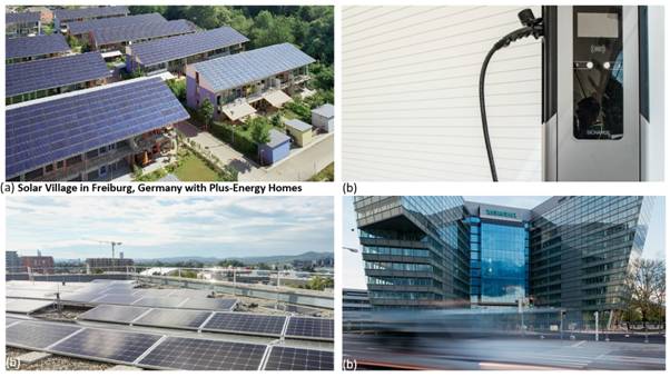 Picture 2, (a)Solar Village in Freiburg, Germany with Plus-Energy Homes, (b) A corporate headquarters opens in the northern part of Vienna