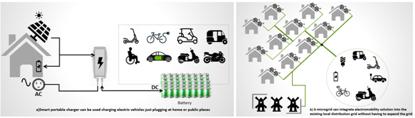 Picture 3, a) Smart portable charger can be used charging electric vehicles just plugging at home or public places, b) A microgrid can integrate electromobility