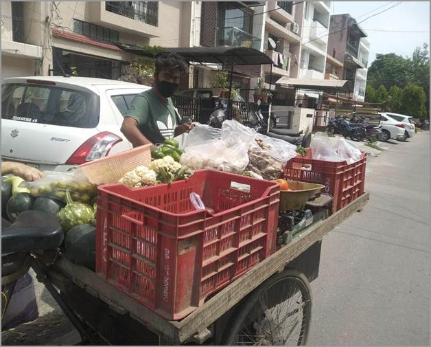 A street Hawker is selling vegetables in Sector - 37, Chandigarh during the Lockdown